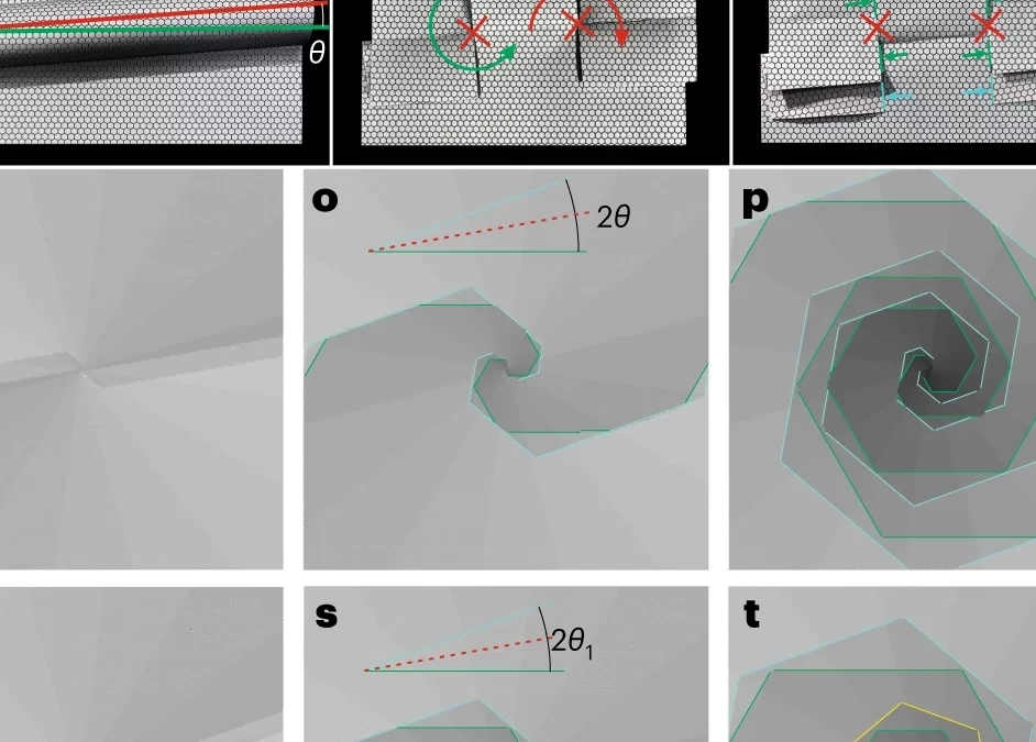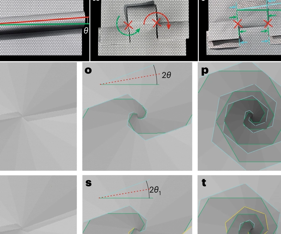 The properties of two-dimensional (2D) van der Waals materials can be tuned through nanostructuring or controlled layer stacking, where interlayer hybridization induces exotic electronic states and transport phenomena. Here we describe a viable approach and underlying mechanism for the assisted self-assembly of twisted layer graphene. The process, which can be implemented in standard chemical vapour deposition growth, is best described by analogy to origami and kirigami with paper. It involves the controlled induction of wrinkle formation in single-layer graphene with subsequent wrinkle folding, tearing and re-growth. Inherent to the process is the formation of intertwined graphene spirals and conversion of the chiral angle of 1D wrinkles into a 2D twist angle of a 3D superlattice. The approach can be extended to other foldable 2D materials and facilitates the production of miniaturized electronic …